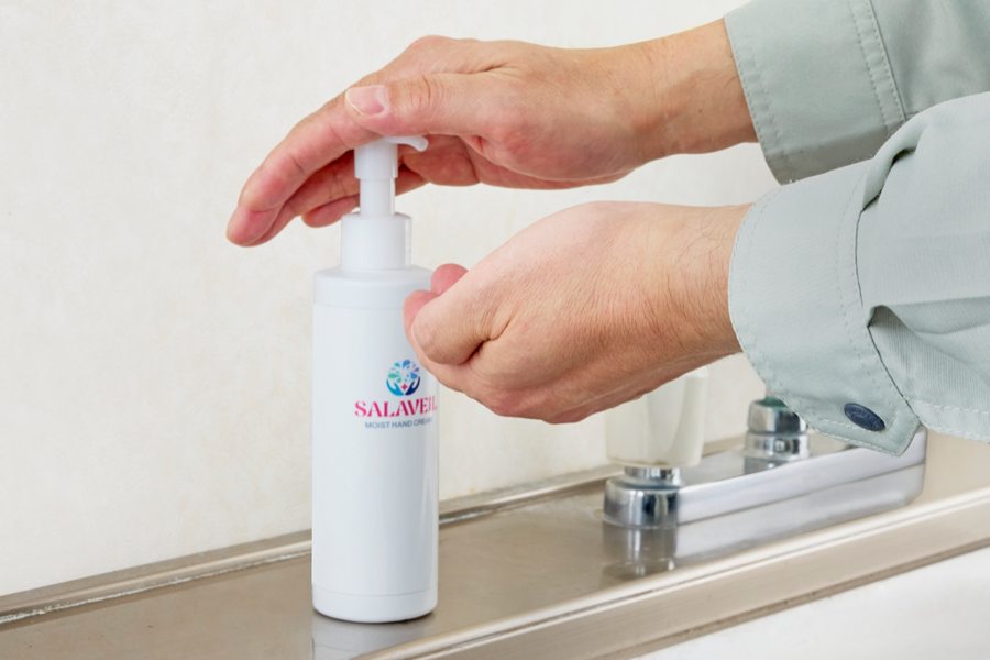 サラヴェールは、個人使用だけでなく、職場での共有利用も想定しています。洗面台や作業スペースに置きやすいポンプタイプを採用し、