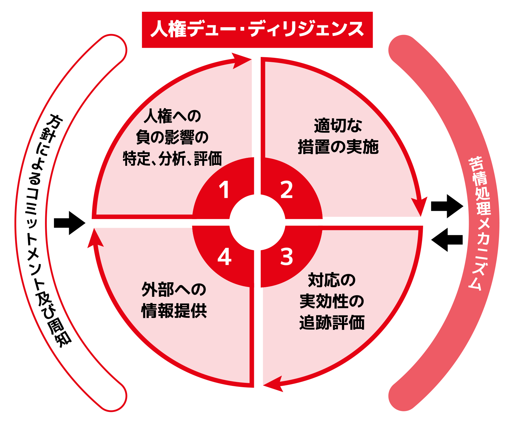 ニッペコは、国連の「ビジネスと人権に関する指導原則(UNGPs)」の手順に従い、日本国及び各国の法・規約に基づきながら、人権デュー・ディリジェンスを進めています。具体的には、①「人権への負の影響の特定、分析、評価」 ②「適切な措置の実施」③「対応の実効性の追跡評価」④「外部への情報提供」を行い、継続的なプロセスを行って参ります。